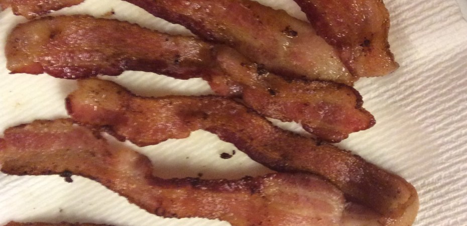 One key step is to turn the bacon as soon as it starts to fry. This stops it from curling and helps it to cook evenly! (Add fresh cracked pepper again to get some great flavor!). Turn the bacon often to avoid burning and to ensure it cooks evenly. Don’t leave the stove. Be careful to ensure it doesn’t burn. (If you are lazy or busy doing other things, you can line a sheet pan with parchment and lay the bacon side by side and bake in the oven at 375 degrees’ – turn once about 8 minutes in and cook for 15-20 minutes-turning more often will get best results!, just like it is in a frying pan!).