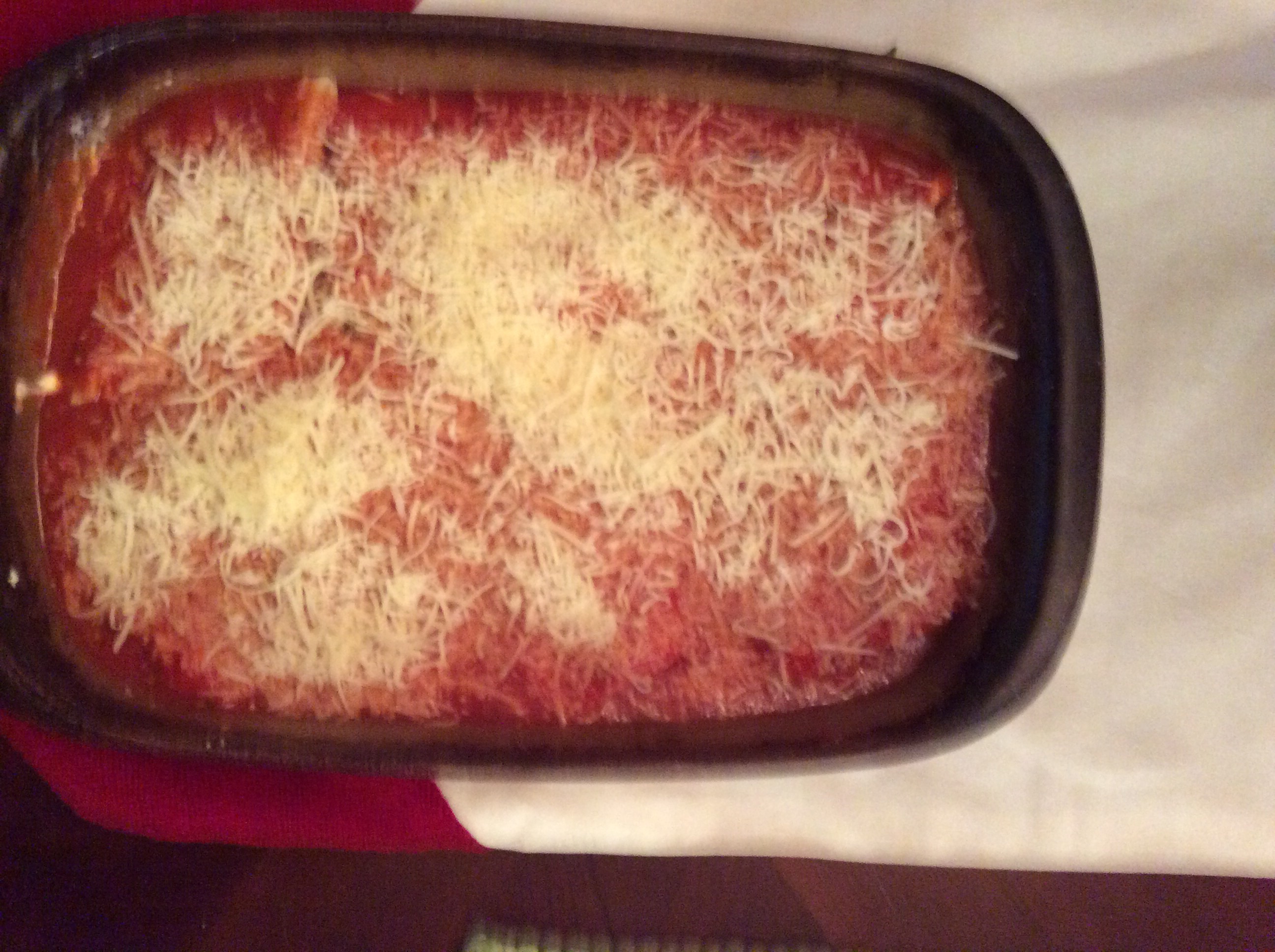 Cover the bottom of a 9 x 13 inch baking dish with tomato sauce (approx 1 cup).