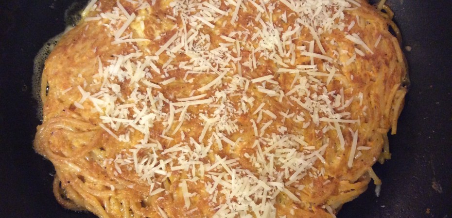 Heat a medium skillet on high and add 1 tbls olive oil to skillet and lower heat to med-high. Add the spaghetti mixture and press it into the form of a pancake. Heat for about 5 minutes or until golden brown. Remove from skillet, add another tbls of olive oil to the pan and add back to the skillet to cook the other side.