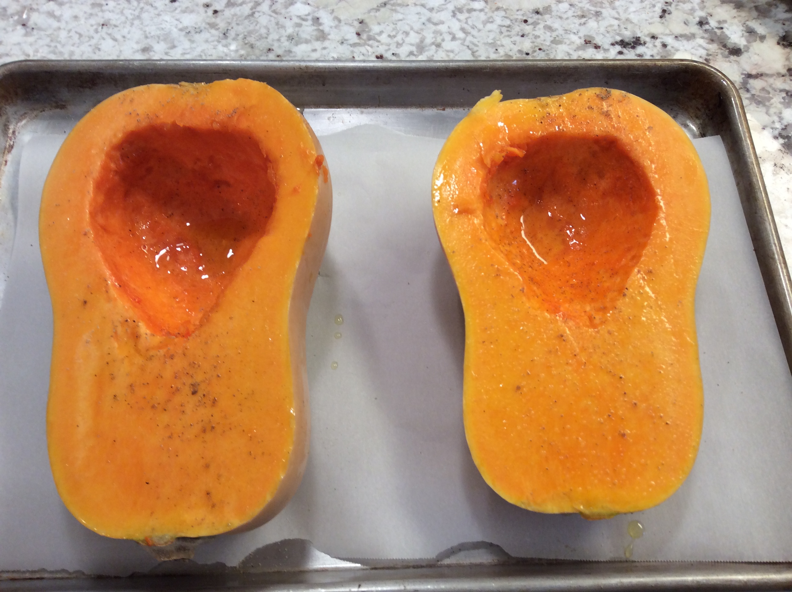Preheat the oven to 425 degrees Fahrenheit and line a baking sheet with parchment paper. Place the butternut squash on the pan and drizzle with just enough olive oil to lightly coat the squash on the inside. Rub the oil over the inside of the squash and sprinkle it with salt and pepper.