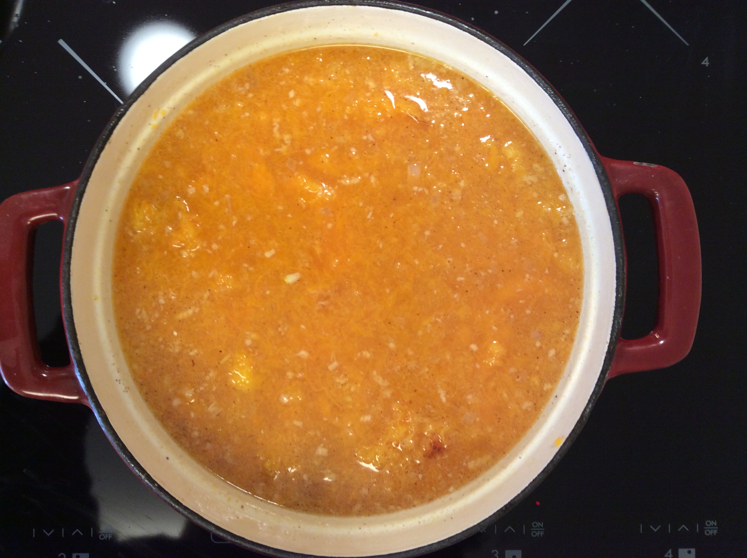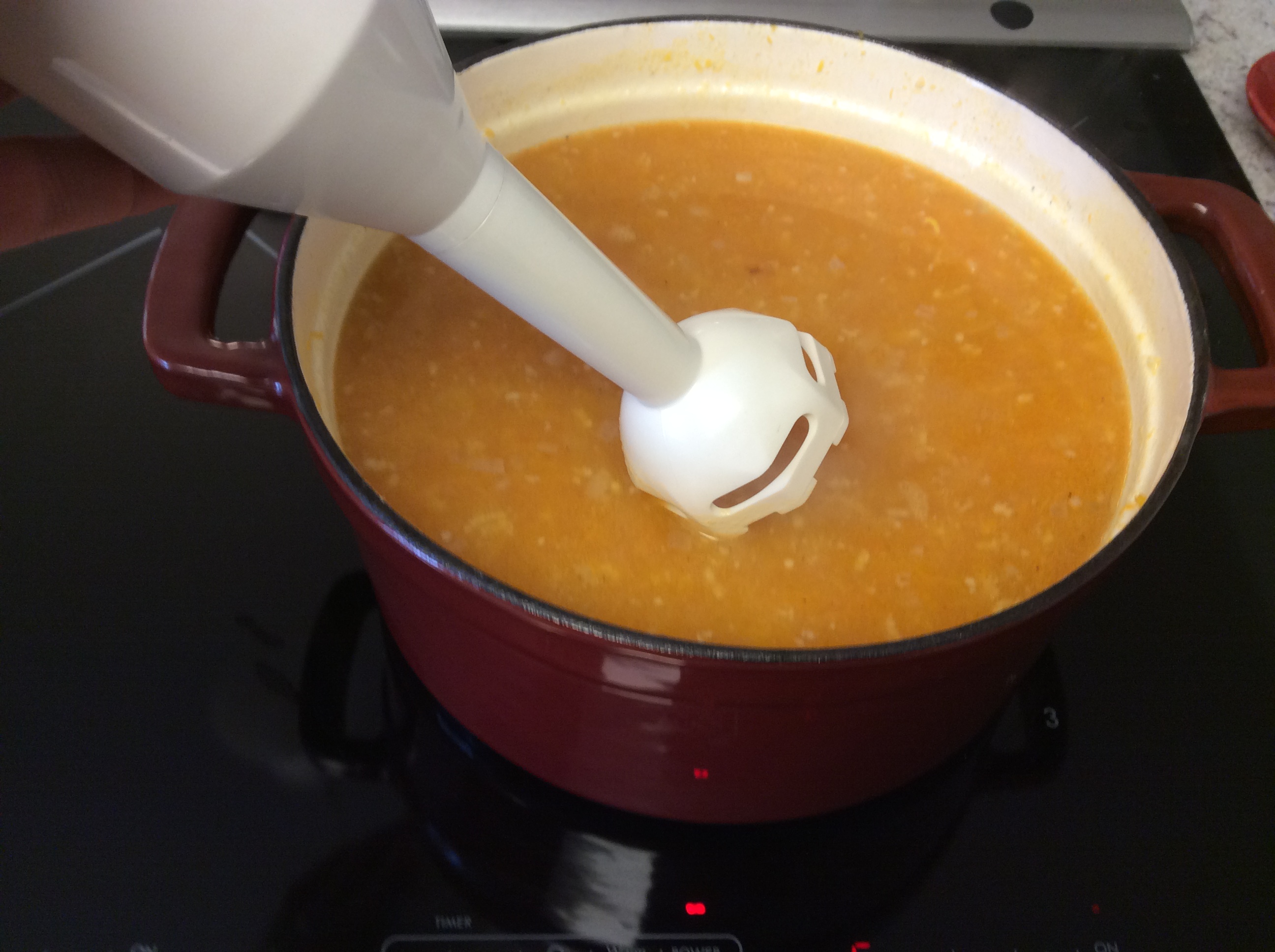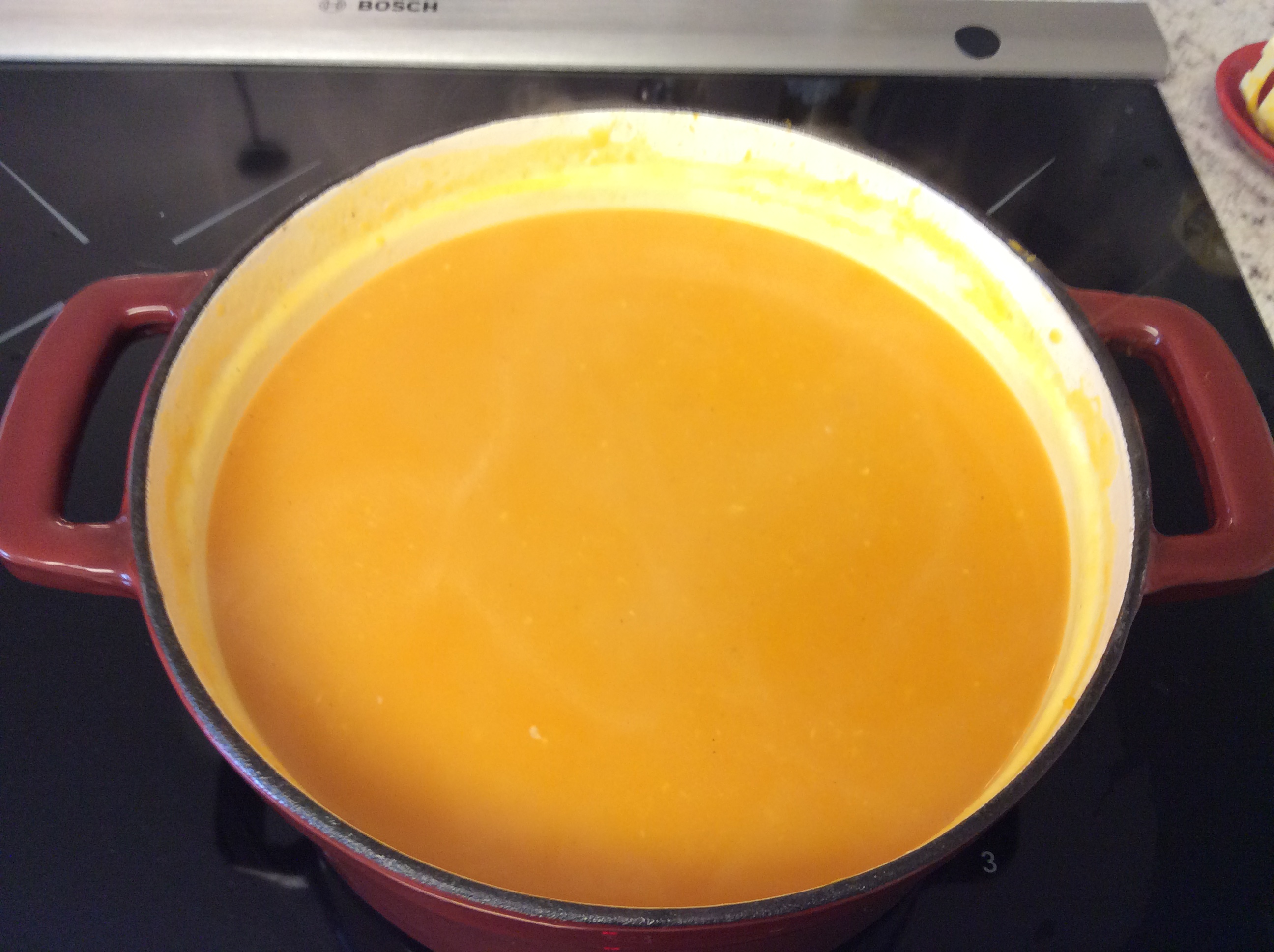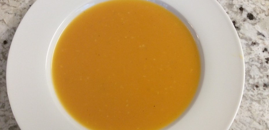 I was inspired to make this recipe because I tried to purchase Panera Bread butternut squash soup for a sick friend who loves their version but they have removed it from their menu! I searched the Internet for recipes and found one that got excellent reviews on the web site http://www.cookieandkate.com. I don’t have a quality soup blender so I did this the old-fashioned way and made the soup in a pot and then used an immersion blender to smooth the soup. I doubled the recipe so the measurements are a bit different but it turned out great.