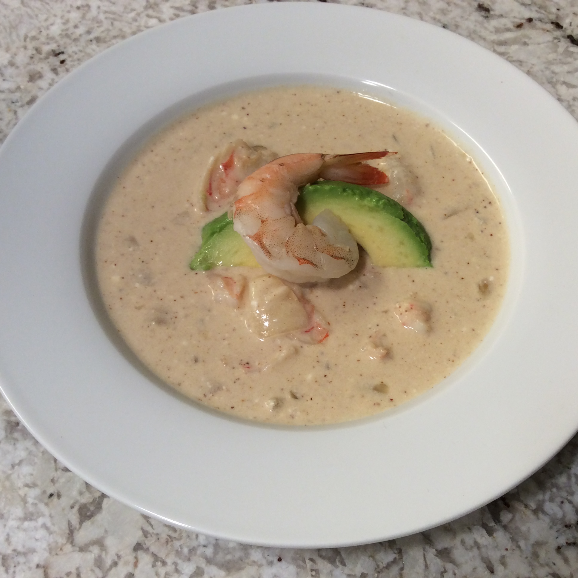 Cut shrimp into small pieces; add to soup. Simmer 5 minutes longer or until shrimp turns pink. Add about a cup of hot soup to sour cream them return it to the pan, stirring constantly. Heat for about 1 minute and serve. Garnish avocado and additional shrimp if desired.