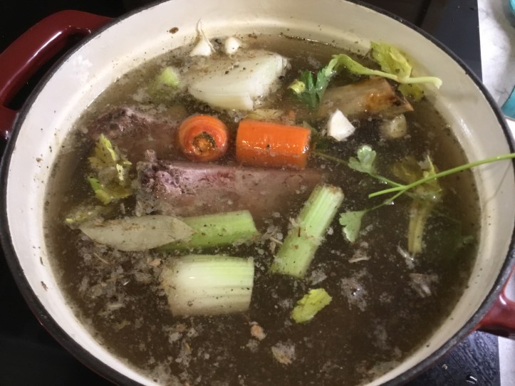 Before making this recipe I made a beef stock from the rib bones and meet from the Prime Rib. I add the ribs to 2 quarts of water with roughed cut onion, 2 carrots, 2 celery ribs, salt, a tablespoon of pepper corns, 2 cloves of garlic, onion powder and garlic poweder and simmer on med/low heat for 5-8 hours. The longer the better. You can pick the meat off the bones and use for the soup or discard them. Strain the broth using a fine mesh strainer and cool in fridge for 2-3 hours and remove any fat from top before making the soup.