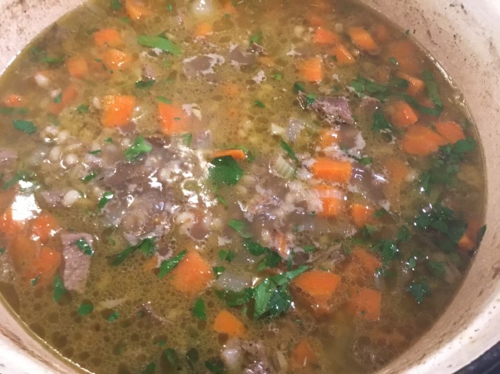 - Simmer over medium heat until the barley is tender (about 1 hour). Add a handful of chopped parsley just before serving.