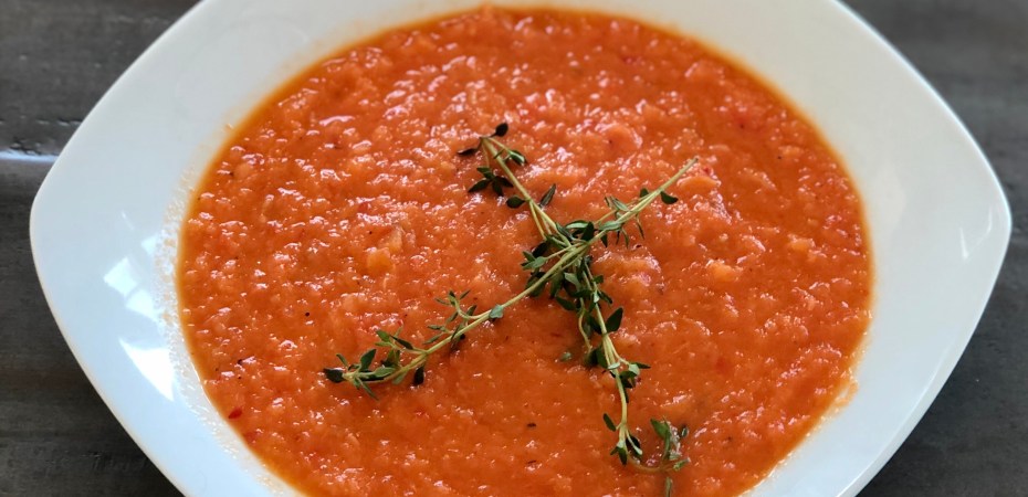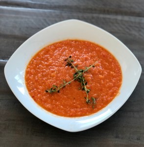 I saw this recipe on The Kitchen (Food Network) and just had to try it! Sunny made this with a white bread cheese toast but Geoffrey Zakarian wouldn’t even take a bite until she forced him to so I’m leaving the lame processed cheese toast out. You can find that at this link if you’re interested in trying something that should have never made its way to TV!! https://www.foodnetwork.com/recipes/sunny-anderson/sunnys-simple-roasted-tomato-soup-with-broiled-cheese-toast-8050386