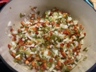 - Sauté Chilis and Aromatics: Add the bacon grease and oil to a large heavy pot or Dutch oven (6-quart), over medium-high heat. Add the chopped chiles, red bell peppers, jalapeño peppers and onions. Cook for 5 minutes or until the vegetables just start to become translucent. Add garlic and cook 1 minute longer. Transfer all the sautéed vegetables to a bowl and set aside. No need to wash the pot, you’ll use it to brown the meat.