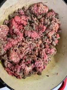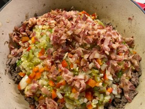 - Brown the Meats: Add the cubed beef chuck to the pot and cook, stirring often, until lightly browned on all sides, about 4 minutes. Add the ground beef and sausage and cook for 7-10 minutes, stirring to break up the sausage and ground beef, until the meat is no longer pink. Return the cooked vegetables to the pot along with the reserved bacon.
